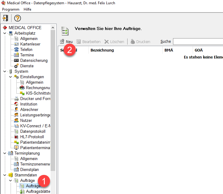 Starten Sie zunächst das Medical Office Datenpflegesystem, wählen Sie dort Aufträge/Auftrag (1) aus und erstellen Sie einen neuen Auftrag (2):