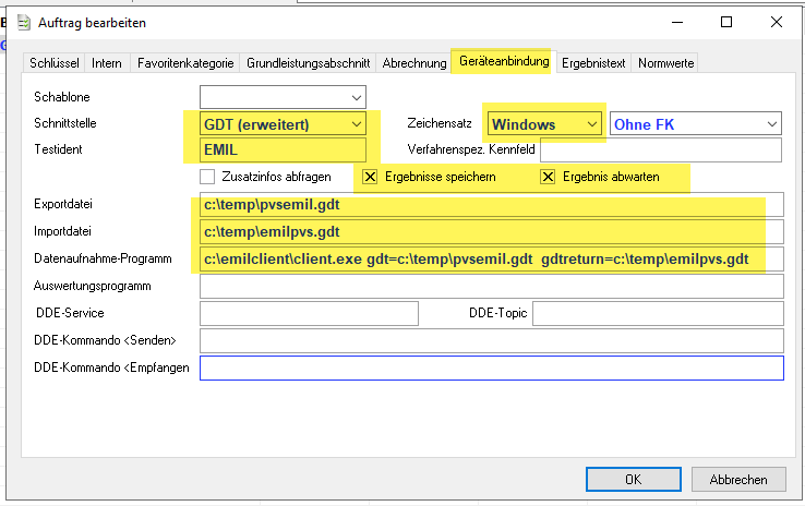 Wechseln Sie dann zum Reiter Geräteanbindung und geben Sie dort den zu Beginn ermittelten Installationspfad zum ITC System ein (hier c:\emilclient). Als Speicherpfad für die Übergabedateien können Sie auch einen anderen temporären Pfad als c:\temp verwenden.