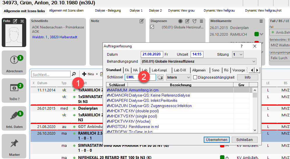 Starten Sie in der Medical Office Akte einen neuen Auftrag (1), geben Sie als Suchbegriff EMIL (2) ein und betätigen Sie Return. Kurz danach startet das ITC System und synchronisiert die Stammdaten mit Medical Office.